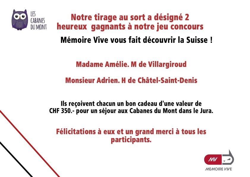 Découvrez les noms de nos heureux gagnants...qui ont acheté un ordinateur équipé de la puce M1 et qui repartent avec un bon d'une valeur de CHF 350 pour un séjour aux Cabanes du Mont dans le Jura.